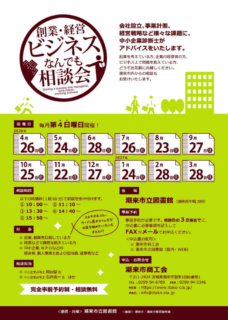 個人創業・会社設立・事業計画・経営戦略など様々な課題に、中小企業診断士がアドバイスをいたします。 ◇開催日 毎月第4日曜日 ◇相談時間 ①10:00~ ②11:10~ ③13:30~... -